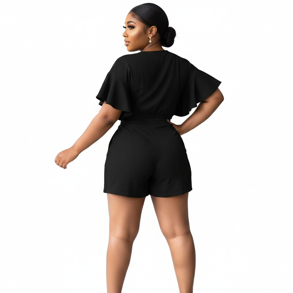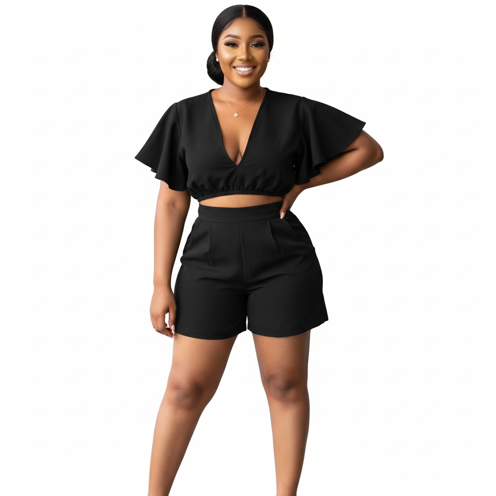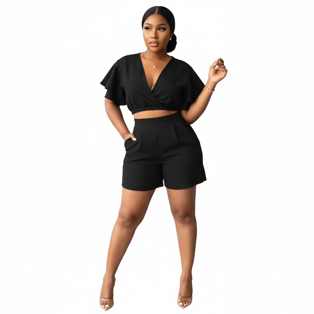 European and American clothing Amazon AliExpress hot sale ruffled short V-neck top casual shorts multi-color two-piece set